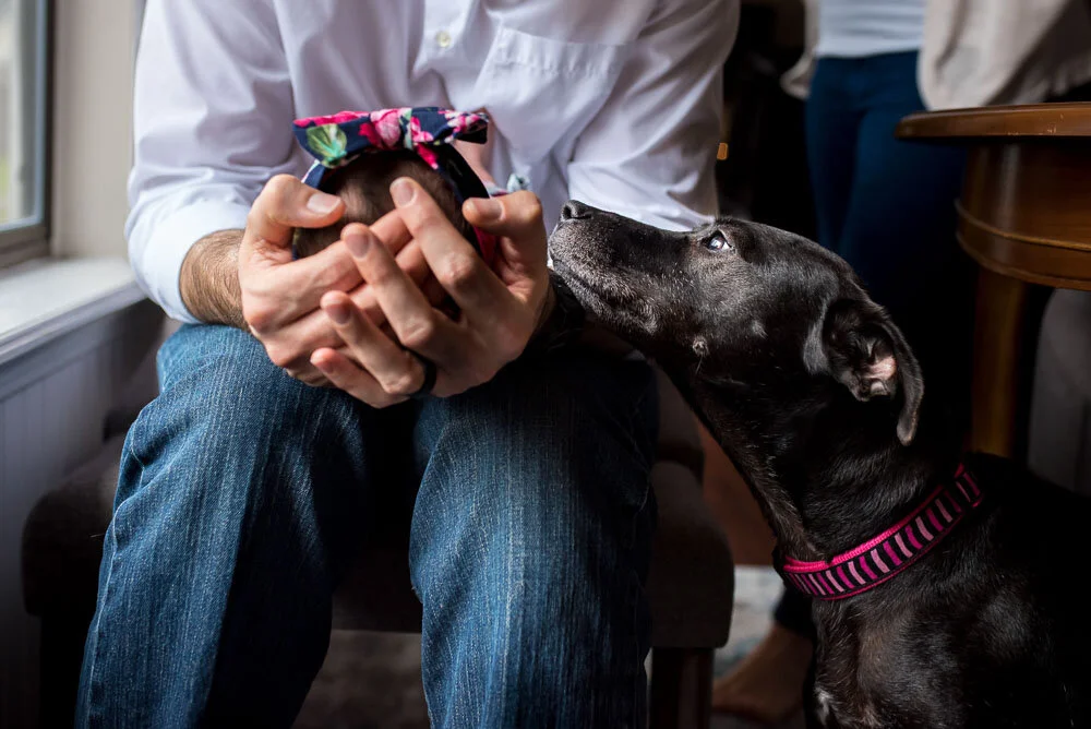 Welcome to our world, precious girl! Nicole and Tommy welcomed their first baby girl into the world and were so excited to capture this special time in their lives. They asked me to photograph their breezy beach maternity session (click here to see) and I was honored to come to them for an home newborn photography session. I love that they included their dogs in their images, too!